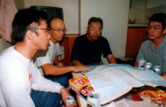 部屋に荷物を置いてから,4人部屋に集合して,缶ビールやジュースを飲みながら明日のルートの確認をする。明日は,1日暑い中を長時間走るので,早めにお開き。