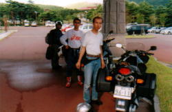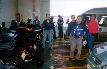 車両甲板に行ってみると,昨日止めたときにはいなかった私たちのバイクの後にびっしりと車が並んでいた。(当たり前なんだけどね。)後の車が動いてくれないと,バイクを動かすことさえできない。荷物を積んでしばらく車が動くのを待つ。後側の通路を開けてくれたので排気ガスで目の痛い思いをしなくてすんだ。