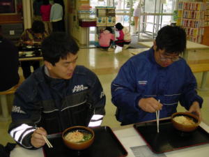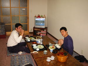 夕食は魚のフライ定食にカツオのたたきがついたような感じ。さっき酒屋で買ってきたビールをコップについで乾杯。バイクのこと、今日、明日のルートのことなど話に花が咲き、買ってきたビールが、すべて空に。