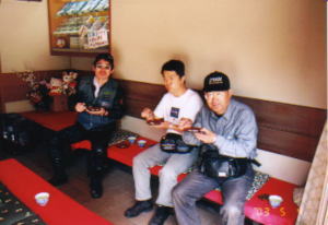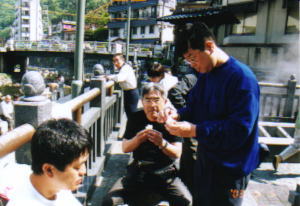 生卵を買ってつけておくと温泉卵になるそうなので,4人で1パック(5個)を買ってつける。風呂に入っている間にゆで卵になるからということで話がまとまる。何せ90°のお湯がわき出ているのだそうだ。さとうさんはブーツや皮パンを脱いだりきたりするのが大変ということでパス。ゆで卵の番をする。