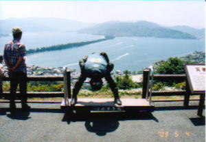 ここでも駐車場(¥300)にバイクを止めてケーブルカー&リフトに乗る。かなり混んでることを覚悟していたが,登りはほとんど待たずにリフトに乗ることができた。(リフトの方が見晴らしがいいのでリフトで登る。)確かにガイドブックに載っているような天橋立が見える。絶景である。この日は天気が良く見晴らしは最高だったのだ。