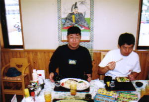 みよしさん,いしふねはみそかつピラフ。はらださんは天とじ丼,さとうさんは逆オムハヤシライス。ちょっと早い昼食。温泉町では卵。ハチ北口ではもつ鍋と常に何かを食べていたので,ここの食事でおなかがぱんぱんになりました。