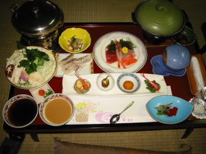 一風呂浴びて夕食。大きなお膳にいっぱいの食事 しかもその後、まだまだ料理がでてきます。結局、満腹になってご飯を食べなかった人も…。