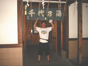 源泉をそのまま引いているのだが、かなり熱い。結局、ふじもとさんは水でうめたお湯をかけるだけで、湯船には入れませんでした。