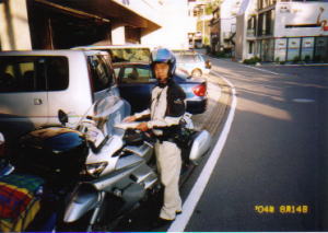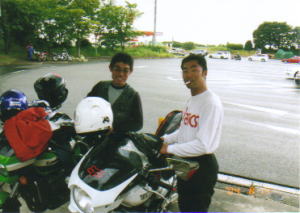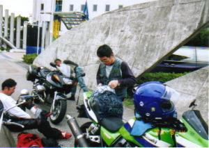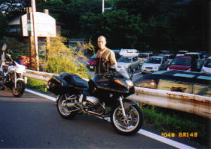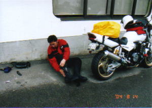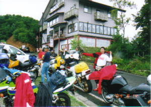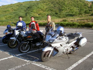 出発直前 FJRの後ろの車の奥に車庫がありました。ホテルからは少し歩きますが、全員のバイクが屋根の下に収まりました。