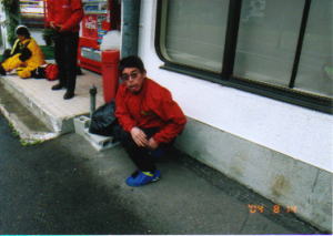 湯沢スキー場付近で雨が降り出したので、ホテルの軒下をお借りしてカッパを着る。