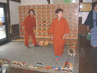 城崎の外湯には,下足番がいて帰るときには浴衣を見てその旅館の下駄をそろえてくれます。