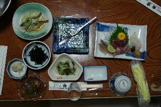 メニューはさしみ(ひらめ、あじ、はまち)、アジの三杯酢、酢の物、ひじき、ところてん、煮魚、サザエや貝の焼き物、伊勢エビのみそ汁。さすがに新鮮な感じで美味でした。個人的にはあじの三杯酢と刺身が良かったです。でも、煮ものがあまり好きではないいしふねがおいしく感じた煮魚はきっとおいしかったのでしょう。ご飯もいっぱいおかわりして、氷水もたくさん飲みました。みんな一様にここに泊まれればいいなあ。と思っていたようでした。酒類の好きな人はたまりません。食べ終わったあと、みんな少し横になっていました。