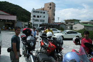 またぐとやけどしそうなシートにまたがり、昼食会場の民宿・大岩を目指します。こんなに暑くてばててしまって、昼食が食べられるんかな。などといっているうちに大岩に到着。大きなビルでこれって民宿っていうの。という感じ。隣の旅館よりずっと大きい民宿でした。