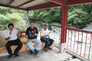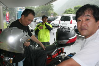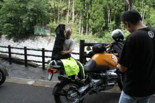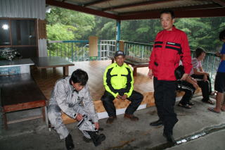 10:00 屋根のある駐輪場に何とか滑り込む。私たちが入ってからさらに雨足が強くなる。雨の様子を見るのをかねてゆっくり休憩。ラフティングの拠点となっているようで,京阪神ナンバーの車がいっぱい来てました。