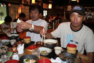 メニューを見ながら,剣山でリフトに乗ったと思えばどんなもんでも注文できるでぇ。でもみなさんいつもの予算で,そば定食,天ざるそばなどを注文。結構おいしかったです。私は横に置いてあるごまふりかけが,香ばしくて,食感が気に入って一番良かったような。