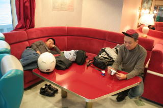 普段,宇高航路に乗り慣れていると,乗船してすぐに動かないことも,船内のイスや売店の雰囲気が違うのも新鮮。船内では今日のルート確認などをして腹ごしらえをする人も。