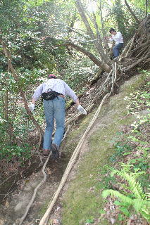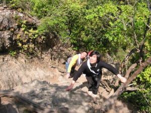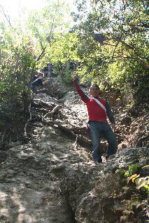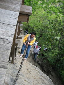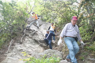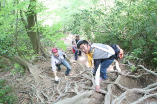 途中,鎖につかまりながら上ったり,木の根を手すり代わりにしたり。普段歩き慣れていない体には,とにかくきつい登り道。