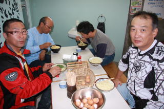 三島製麺到着。近くでバイカーズミーティングをしていてすごいバイクの数だったので、とても無理かと、覚悟していったけれど、数人しか並んでなくて助かりました。全員冷たいうどん。ここはだしはないそうで、醤油と卵で食べました。