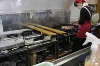 広い鉄板で焼きそばを焼き,左に置いてある板の上に皿を並べていきます。