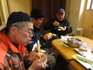 奥では飲食スペースでできたての玉子焼きを食べる。
