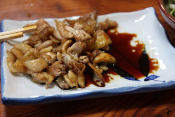 コースをお願いしていたので席に座るとどんどん出てきます。右の写真が今治の焼き鳥の定番,皮。
