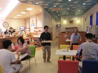 高速に乗る前にパン屋さんで朝食。イートインが選べる店だったので,みんなで飲み物を注文して食べる。