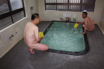 共同浴場には写真のように脱衣場と浴室の仕切りさえないところもあります。ここも私たちだけでした。