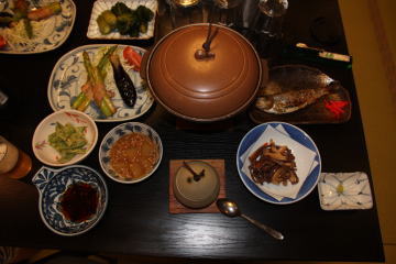 夕食。たくさんの料理。宿からツーリングプラン(バイクで行きませんでしたが)ということで焼酎をいただきました。