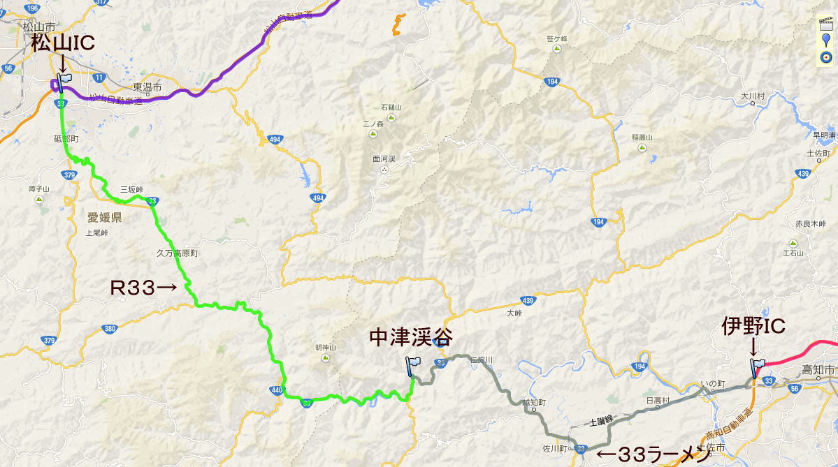 ルートを検討。時間がありそうなので,松山経由R33で行くことにする。