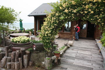 店はログハウス。薪ストーブもありました。駐車場や回りのベンチも木がいっぱい。