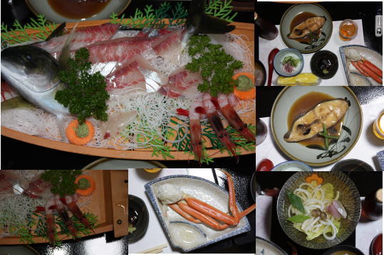 写真の舟盛りが4種(ひらめ、たい、真アジ、石鯛)このほか焼き物と天ぷら、デザートもでました。