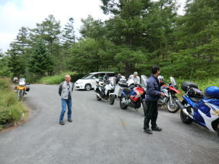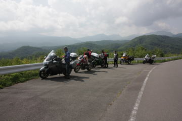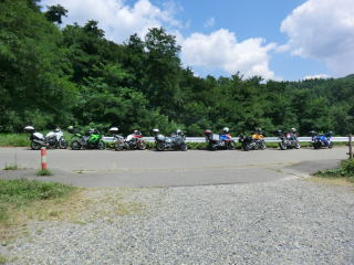 山田峠にて各車の記念写真 山の稜線にあるので群馬県側も長野県側も見ることができます。