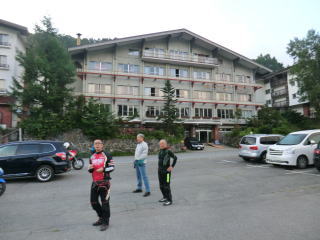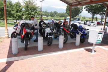 玄関のすぐ横の駐車場の一角がバイク用の駐輪場となっていて、そこへ誘導してくれました。16時過ぎの到着でしたが、表の駐車場は満車状態でした。