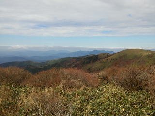 途中で森林限界を超えたのか、木がなくなり視界が開ける。とても天気がいいので周りの山が一望。
