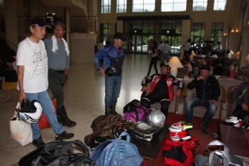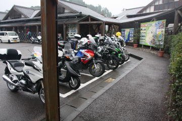 バイクは軒下に置かせてもらいました。大きな軒だけど細かい雨が風に飛ばされたのでカバーを使った人が多かった。