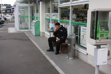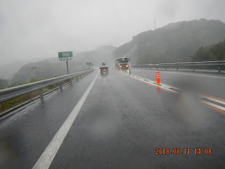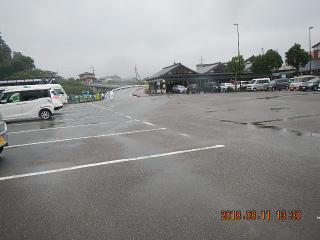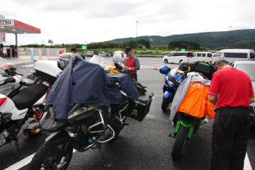 川南PA 途中で雨もあがり、カッパを脱ぐ人、これからまだ降りそうなのでそのままカッパを着ている人。