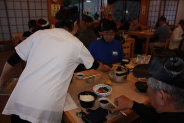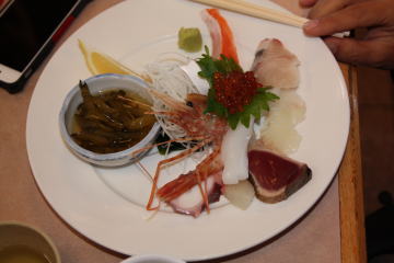 写真は、かまの塩焼きと刺身の盛り合わせ。おいしくいただき、お腹もいっぱいになりました。