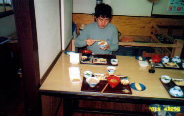 お好み焼きにも気がひかれるのだが,ラーメン定食にする。運ばれてきたびっくり!ふつうのラーメンより大きい気がするラーメンが豚カツ定食(いしふね),揚げ餃子定食(はらださん)についてきた朝食を腹一杯食べてきたせいか,ラーメンだけで満足だったが,私は出されたものを残さない主義なので,なんとかがんばって食べる。(この生活が腹まわりの脂肪に変わる。)