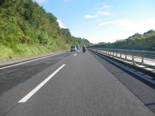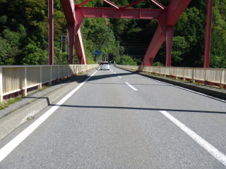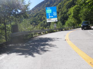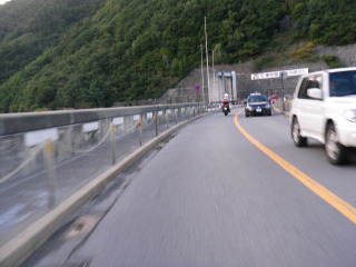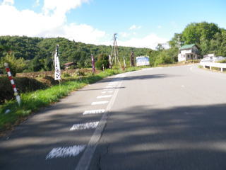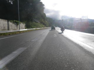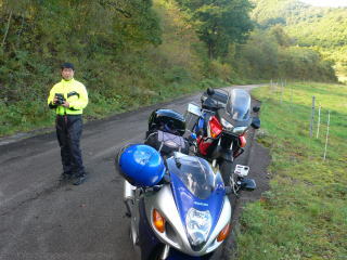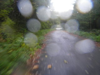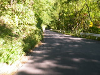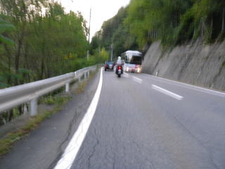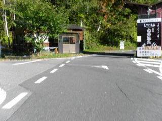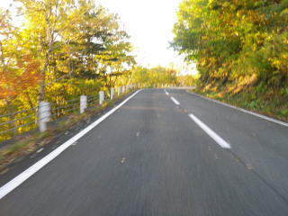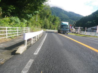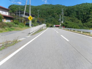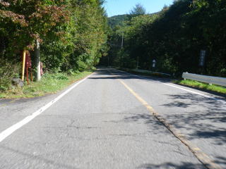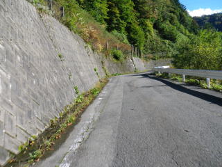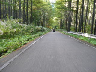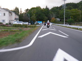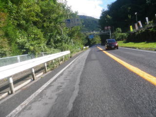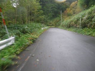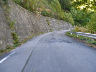 中央線のない山道が続く。それほど混んでいないのでまあまあのペースで走るが,ときどきあらわれる濡れた路面や落ち葉が怖い。