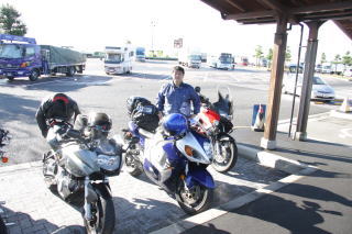 いつものようにハヤブサが早めに行くと,すでにバイクが一台止めてある。後ろ姿はバラさんでバイクもバラデロだけど,なんか雰囲気が違う。あれー,カラーリングが違うじゃん。バラさん曰く,衝動買いだそうです。今回のバラデロはインジェクション付きなので低速があって乗り心地もスムーズとか。うちのクラブのメンバーはバイクを変える前にはメンバーになかなかいいません。