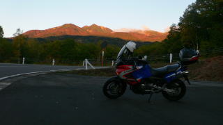少し走ると朝日の当たる乗鞍岳が見えてきたので記念撮影。