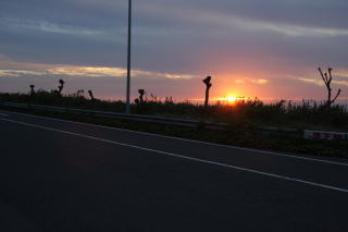 太陽が昇ってきて,濡れていた路面も乾いているところがでてくる。