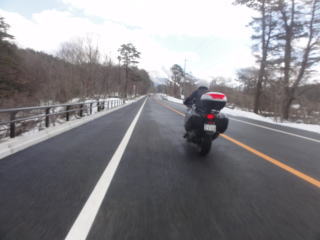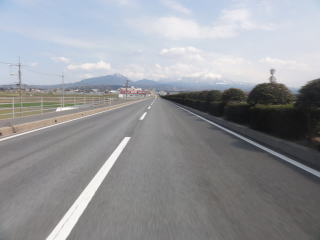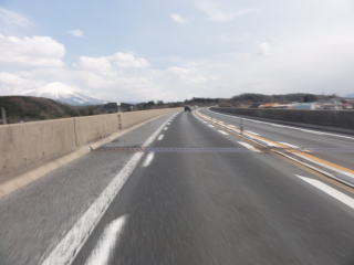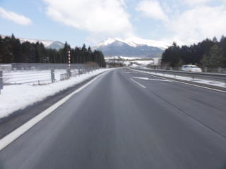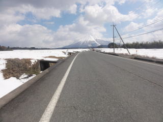 正面の雪の大山を見ながら…。路面も乾いていい感じ。