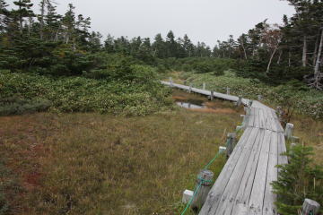 こんな木道を行くと御岳展望台。ここからは雄大な御岳が間近に見えるはずだけど。