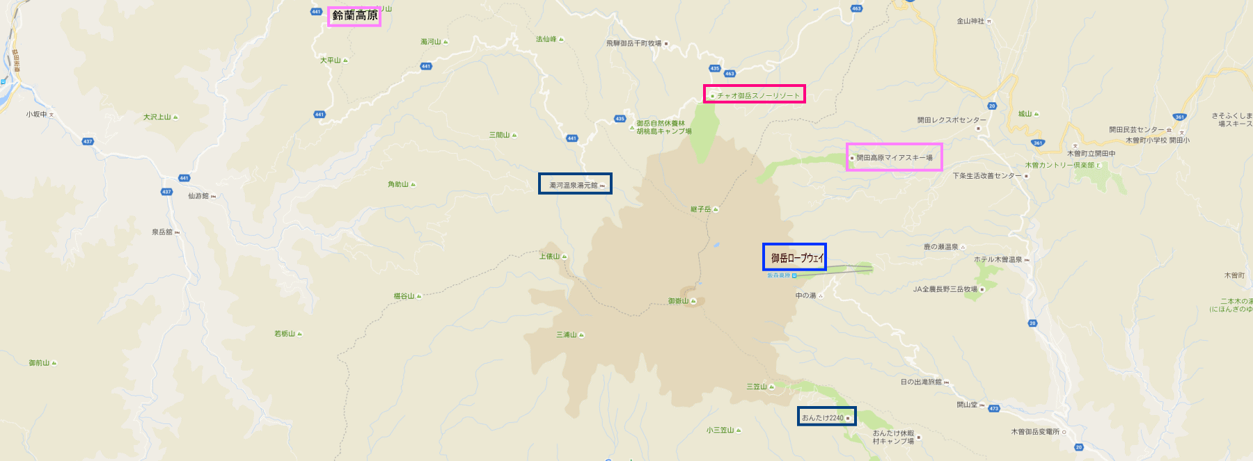 地図&サイトを見ていると、御岳に田の原という山頂に近いところがあるらしい。私は御岳ロープウェイが一番近いのかと思っていたが、車が行けるところだと田の原山荘が一番近いような気がする。 ということで一番の目的は御岳田の原山荘。あと御岳を中心にプランを考える。