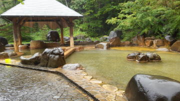 私だけになって貸し切り露天風呂。屋根のある方は少しぬるめ。(源泉から流れ込む湯量が少ない)