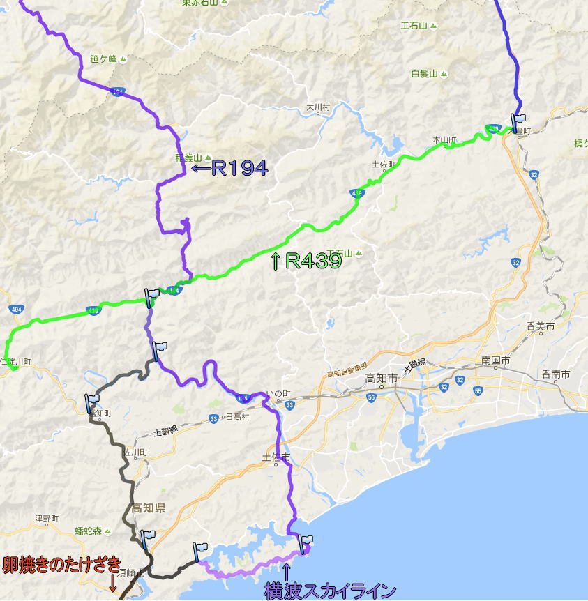 せっかくの3連休。用事と天気の都合で最終日だけ都合がついたので日帰りツーリング。 秋の3連休はツーリングにはいい季節。 夜明け前に出発、高速道で夜が明ける。 伊予PA 西条からR194 道の駅 土佐和紙工芸村 まだ、朝早いので、店は開いてません。顔を洗っているおじさんもいました。 K33 仁淀川沿いを走る。 横波スカイライン 須崎に出て、もう一つの目的「たけざき」の卵焼きとおにぎり その後、R439(仁淀川〜大豊)を楽しんで帰りました。 約480q