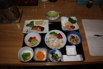朝食。いろいろな山菜があって、おいしく食べることができた。