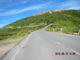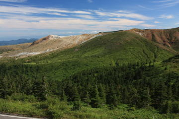 万座温泉まで走る。万座温泉では硫黄のにおいを木が生えていない山を見る。