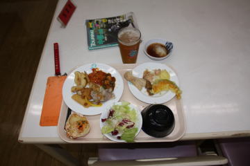 学生さんの合宿の関係でたくさんあるような気もする。他のお客さんだけだと5グループ15人くらい。いつも食べ過ぎるので、ちょっとずつとったけど、やっぱりおかわりしたりして食べ過ぎてしまった。目の前で天ぷらを揚げてくれて、ぱりっと揚がっていておいしかった。こっちでは、りんごも天ぷらにするんだね。