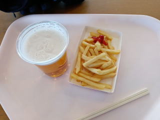昼食はいつものように生ビールとおつまみ、持って行ったおにぎり