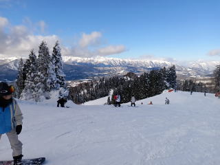 向こう側には大日岳のダイナランドとたかすスノーパークその奥には白馬連峰が見える。