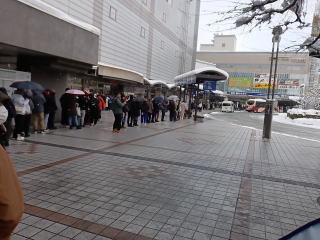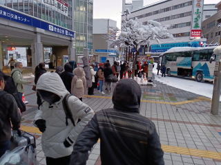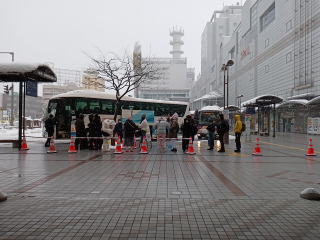 ロードヒーティングかな。歩道には雪がないけど周りは真っ白。バスは蔵王行きだけ行列。