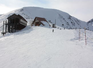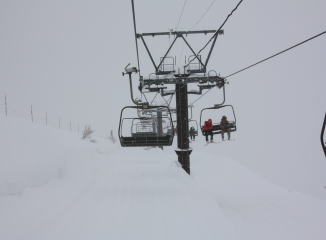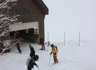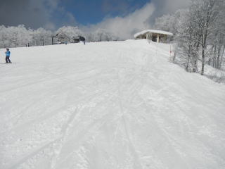 昨夜からの雪でしっかり積もっている。リフト準備の人の様子を見てると膝くらいまで雪に埋まっているので、せっかくだからかんじきを履くことに。なんとか準備してリフトに。初めて履くかんじき、心配したけど、周りをカットしてあるのでちょっと気をつけたら大丈夫でした。山荘からリフト乗り場までもすごい雪でかんじきの効果がわかる。